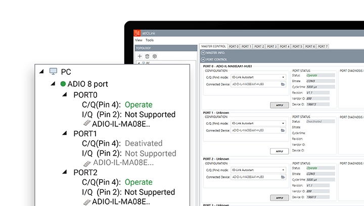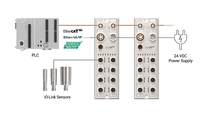 ADIO系列远程I/O中继盒在主站(如PC或PLC)与从设备(包括传感器和执行器)之间传输各种输入和输出信号。IO-Link主站型ADIO-ILM可以将信号从从设备(IO-Link、标准I/O)交换到工业网络协议 (EtherCAT、EtherNET/IP、PROFINET)。IO-Link HUB型ADIO-HUB与ADIO-ILM连接,通过IO-Link通信扩展和中继多个标准I/O。