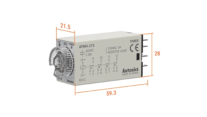 ATM系列小型模拟计时器采用紧凑,节省空间的设计(W 21.5 x H 28 mm),带有一个简单的14针插入式插座。 ATM系列有11种不同的时间范围(0.1s~3h)和各种电源可选。 计时器具有4PDT触点,100ms的快速复位时间和±0.5%的重复精度,可实现高度精确的定时控制。