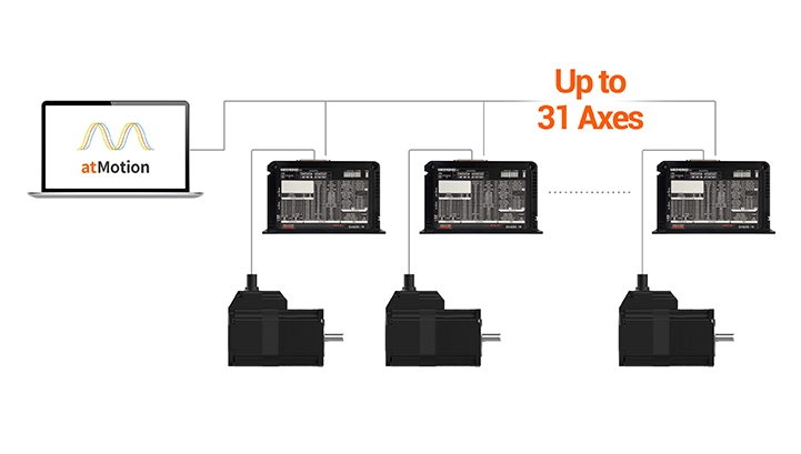 AiC系列具有集成控制器的驱动器,可以使用提供的atMotion软件和 RS-485 通信同时控制多个电机轴。