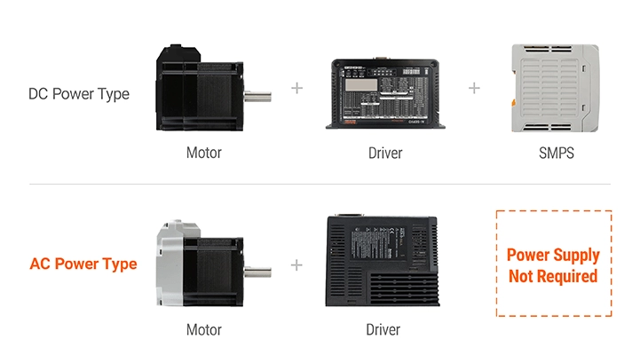 与DC型电机相比,AC电源型闭环步进电机系统在高速驱动期间可保持更高的转矩。电机也不需要单独的电源,从而提供了更灵活的安装选项。