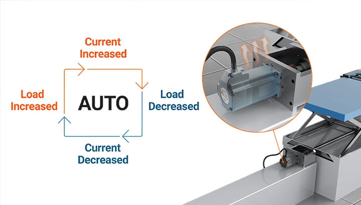 自动电流下降模式会在电机停止(空载)时降低电流,最大程度地减少热量的产生。