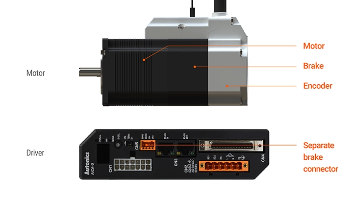 内置制动器型电机和驱动器可以更安全地控制垂直负载。制动器位于后部,单独的制动器连接器连接方便。