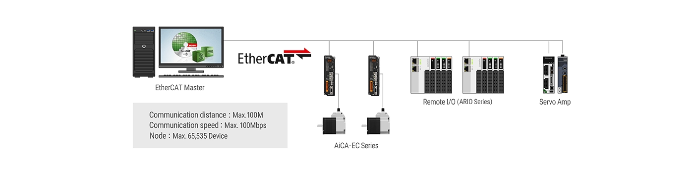 AiCA-EC系列电机系统可通过EtherCAT以100 Mbps的通信速度同步控制多轴的运动。电机系统已完成EtherCAT技术集团的合格性测试,以确保主设备和从设备之间的高度兼容性。